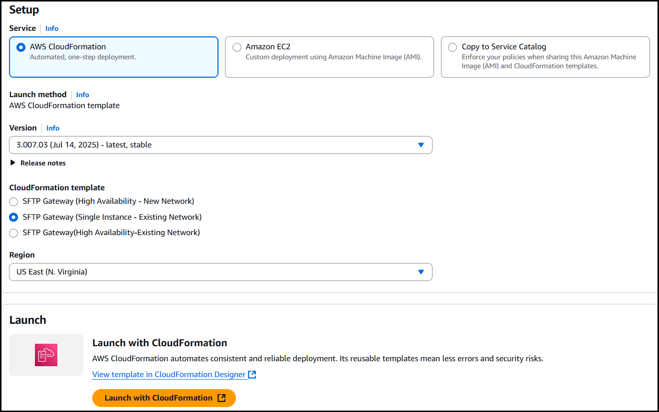 To spin up a Single Instance (New Network) CloudFormation stack of SFTP Gateway: