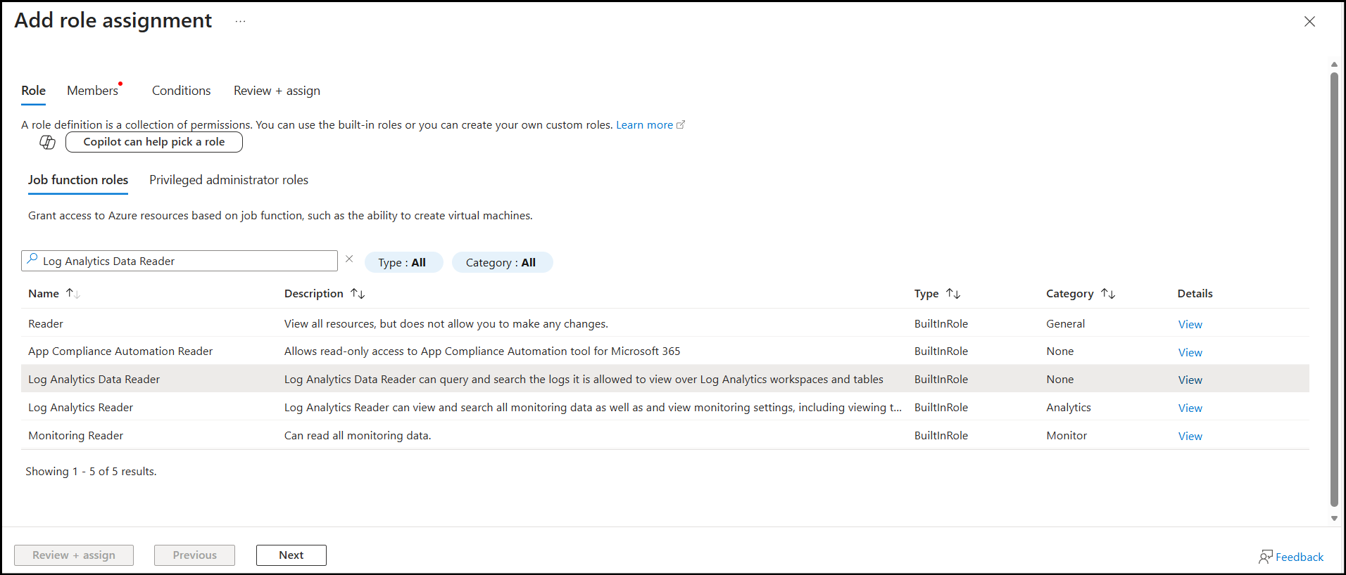 Click + Add ---> Add role assignment and search for the Log Analytics Data Reader role. Select the role and click Next.