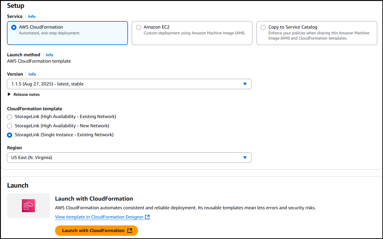 To spin up a Single Instance (Existing Network) CloudFormation stack of StorageLink: