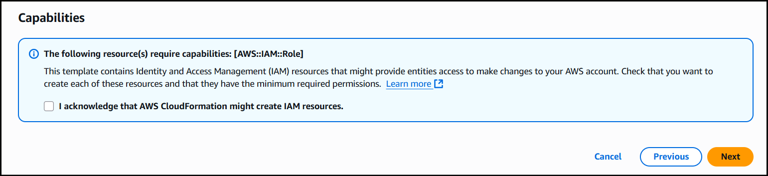 You must check the box that reads I acknowledge that AWS CloudFormation might create IAM resources to give CloudFormation permission to create IAM resources.